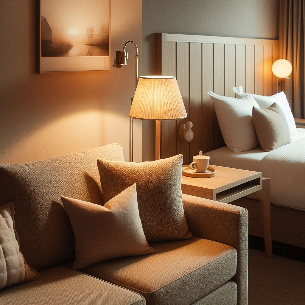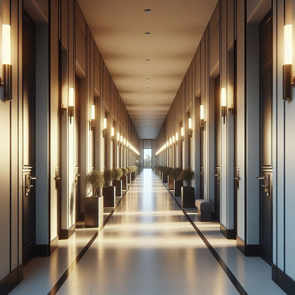 출입문을 지나 로비로 들어서면 이용에 필요한 안내가 벽면에 정리된 형태로 붙어 있어 흐름을 빠르게 이해할 수 있었습니다. 복도는 과하게 밝지 않은 조명 톤이 일정하게 이어져 있었고, 바닥은 물기 없이 말라 있어 이동 시 신발이 미끄러질 걱정이 없었습니다. 객실 번호판은 글씨 크기가 큼직해 통로 반대편에서도 목적지를 손쉽게 확인할 수 있었습니다. 문을 열고 들어가면 침대·TV·테이블이 서로 간섭하지 않는 간격으로 배치돼 있어 시야가 단정하게 잡혔고, 짐을 둘 공간도 따로 구성돼 있어 움직임이 복잡하지 않았습니다. 창쪽에서는 환기구에서 흘러나오는 공기 흐름이 은은하게 들려 실내가 답답하지 않았고, 조명 스위치가 구역별로 나뉘어 있어 머무는 동안 원하는 밝기를 쉽게 조절할 수 있었습니다.