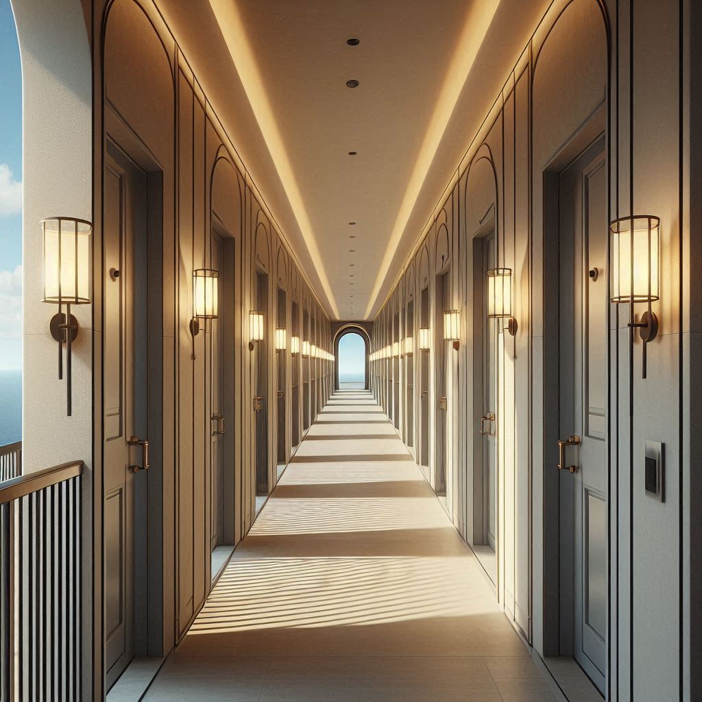 출입문을 지나 로비에 들어가면 벽면 안내가 보기 좋게 정리돼 있어 처음 방문해도 이용 흐름을 이해하기 쉬웠습니다. 복도로 이동하자 바닥은 건조하게 정리돼 있었고, 벽면 색감이 중간 톤이라 눈이 피로하지 않았습니다. 객실 번호판은 뚜렷한 문자로 표시되어 멀리서도 확인이 가능했고, 통로가 구불거리지 않아 이동 경로가 명확했습니다. 객실 문을 열자마자 침대와 테이블, 벽걸이 TV가 자연스러운 거리감을 유지하도록 배치돼 있어 짐을 내려놓고 움직이기 편했습니다. 창가 쪽에서는 은은하게 외부 바람이 들어와 실내 공기가 탁하지 않았고, 조명은 스위치로 구역별 밝기를 조절할 수 있어 원하는 분위기를 쉽게 만들 수 있었습니다. 구조 자체가 단순해 처음 이용하는 사람도 빠르게 공간에 적응할 수 있을 것 같았습니다.
